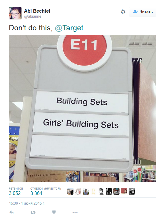 Target тоже отказались от разделения игрушек по гендерному принципу. Сеть магазинов розничной торговли пошла на этот шаг после того, как недовольный посетитель выложил в сеть фото с табличкой «Строительные игрушки для девочек» в одном из магазинов Target. Пост ретвитнули 3000 раз.