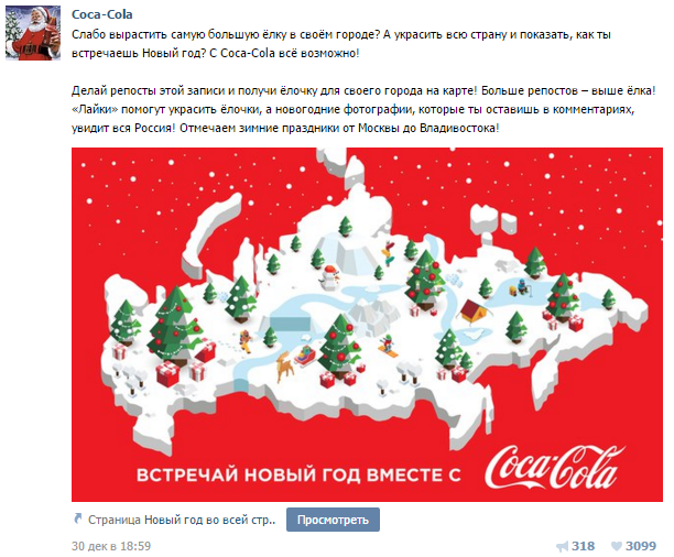 В канун нового года Coca-Cola запустила на своей странице во «ВКонтакте» рождественскую кампанию. Пользователям предлагалось делать репосты и таким образом выращивать елку для своего города. При этом в посте была размещена карта России, на которой отсутствовали Крым, Калининградская область и Курильские острова.