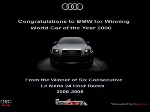 Рекламные войны автопроизводителей на Западе – нередкое явление. Достаточно вспомнить противостояние BMW и Audi, когда баварская компания решила потроллить своего конкурента и повесил билборд следующего содержания: «Поздравляем Audi, которая стала лучшей машиной 2006 года в ЮАР. От обладателя статуса “Лучшая машина в мире” 2006 года». Audi ответила рекламой: «Поздравляем BMW, которая стала лучшей машиной 2006 г. От шестикратного подряд победителя круглосуточных гонок Le Mans 2000-2006». В перепалку вмешалась Subaru, ну как не воспользоваться таким случаем и не обратить на себя внимание. «Мы рады за BMW и Audi, которые победили в автомобильных «конкурсах красоты». От производителя лучших в мире двигателей по версии 2006 г.»