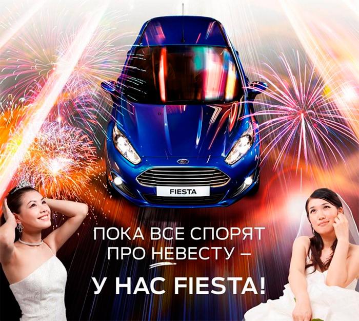 На прошлой неделе «АвтоВАЗ» выпустил рекламный баннер с намеком, что пора сменить подержанные Kia и Hyundai на обновленную Lada Vesta. Через неделю отечественному автопроизводителю ответил официальный дилер Hyundai – «АвтоСпецЦентр Внуково». На своей странице в Facebook компания опубликовала пост с картинкой в поддержку автомобиля Solaris, в котором обыгрывалась рекламная кампания Lada Vesta. Надпись гласила «Наши НЕвесты не ломаются». Свой креатив подготовило и американское представительство Ford. На плакате изображены две азиатки в свадебных платьях и автомобиль Fiesta. Слоган гласит: «Пока все спорят про Невесту – у нас Fiesta!».