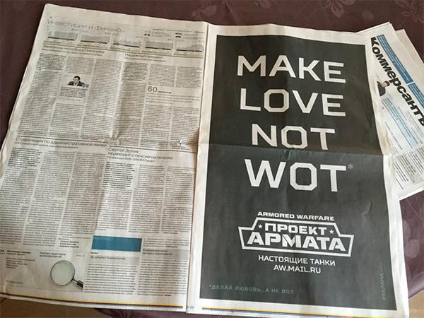 В объявлении содержится слоган «Make love not WOT» и перевод «Занимайся любовью, а не ВОТ». При этом WoT – сокращенное название игры World of Tanks. Однако представили Mail.Ru Group уточнили изданию VC, что «WoT — это устойчивое выражение Waste of Time (тратить время впустую).