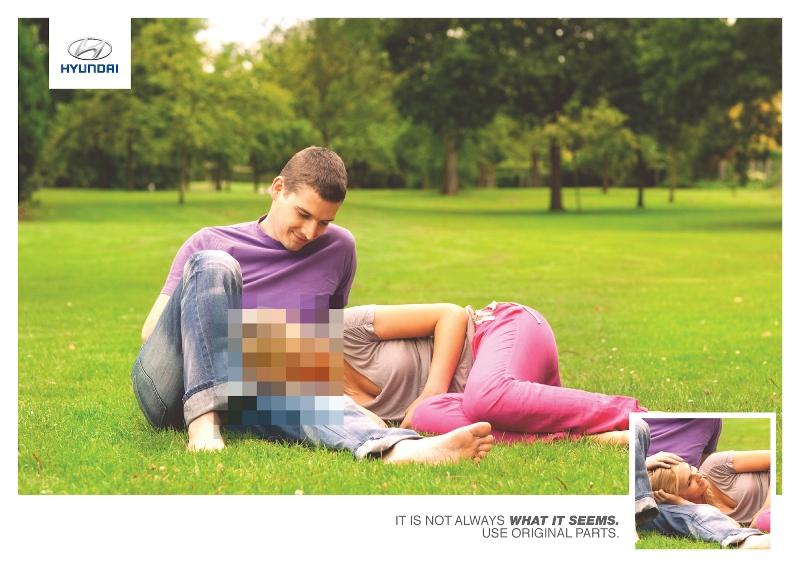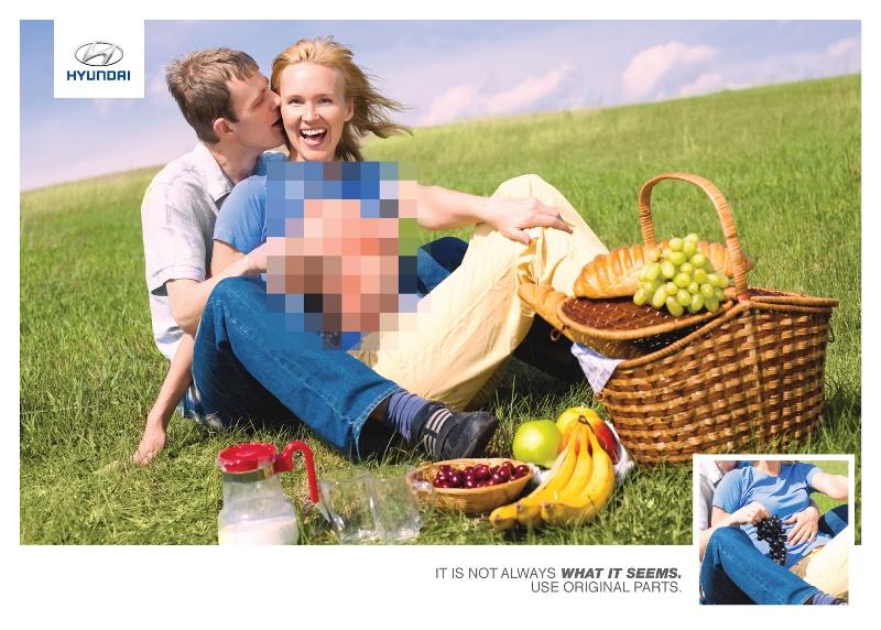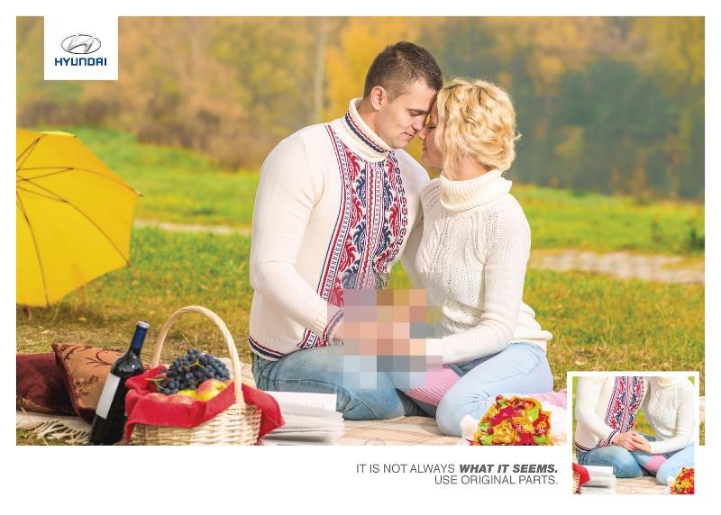 Маркетологи Hyundai использовали в новой рекламной кампании, стимулирующей приобретение исключительно оригинальных автозапчастей, снимки, по сюжету напоминающие традиционные кадры с фотостока: счастливые парочки отдыхают в парке на пикнике. Однако части снимков были закрыты «квадратиками» цензуры, что придало изображениям весьма пошлое прочтение.