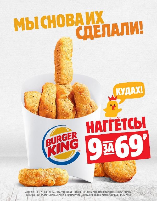 16 мая вышла новая серия провокационной рекламы Burger King. Для продвижения акции «Наггетсы за 69 рублей» разработали баннер с неприличным жестом, адресованным конкурентам сети