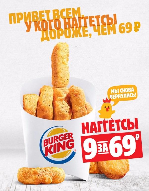 На новом баннере сети ресторанов изображены кусочки курицы в виде неприличного жеста. Картинку сопровождает слоган «Привет всем, у кого наггетсы дороже, чем 69 рублей». Этим жестом в Burger King хотели показать конкурентам, что наживаться в кризис – поступок, не заслуживающий одобрения, говорится в релизе компании.