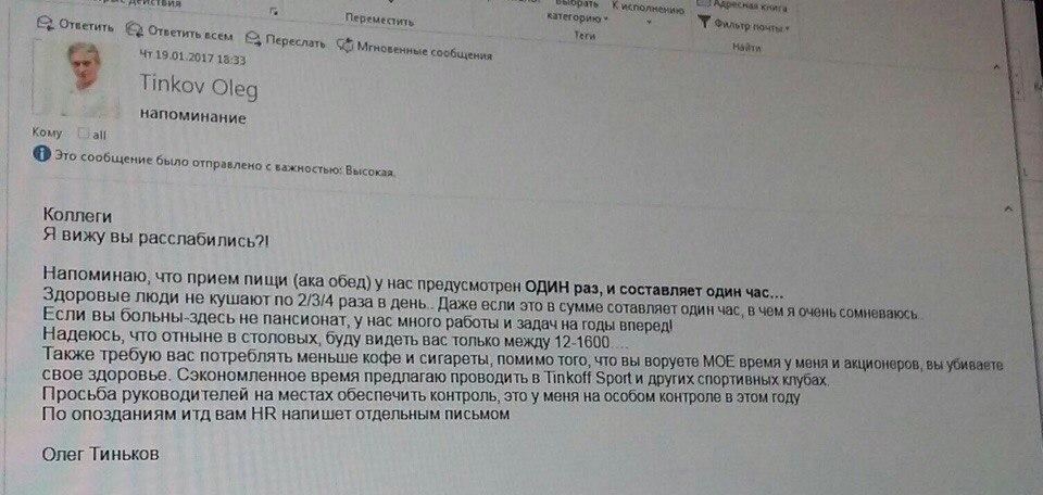 - Здоровые люди не кушают 2/3/4 раза в день. Даже если это в сумме составляет один час, в чем я очень сомневаюсь. - Если вы больны — здесь не пансионат - Также требую от вас потреблять меньше кофе и сигарет, помимо того, что вы воруете мое время у меня и акционеров, вы убиваете свое здоровье. Контроль за соблюдением нового распорядка рабочего дня основатель «Тинькофф Банка» собирается возложить на руководителей подразделений.