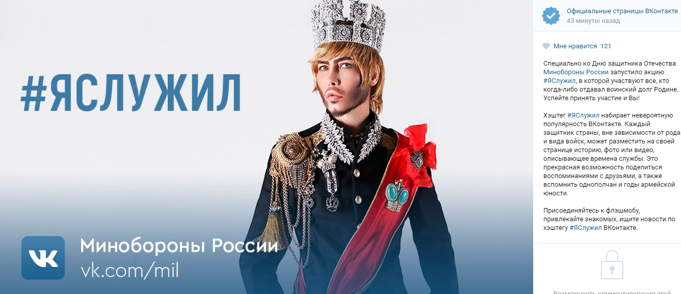 «Минобороны запускает акцию #ЯСлужил в которой могут принять участие все кто защищал Родину на разных рубежах и в разное время… Присылайте фотографии о службе в армии и принимайте участие в их обсуждении вместе со всей страной в комментариях, привлекайте друзей и знакомых, находите однополчан и друзей по службе. [….] Делитесь своими историями из службы, фотографиями и видео, рассказывающими о днях вашей службы и работы, запомнившихся моментах и интересных случаях в социальных сетях с хэштэгом #ЯСлужил».