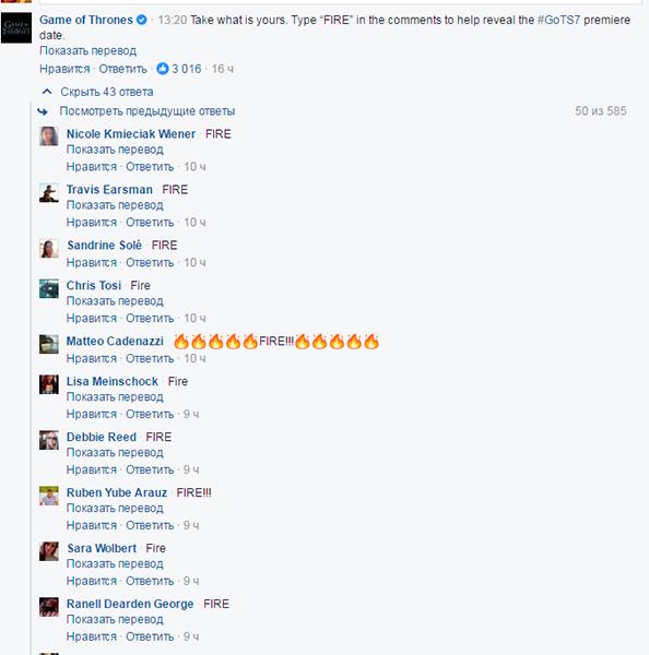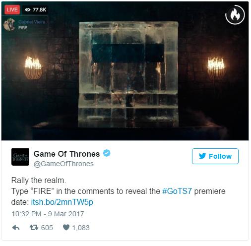 Для этого за процессом таяния нужно было наблюдать на Facebook Live, а приглашения участвовать в просмотре были разосланы заранее. Когда началась передача, поклонников просили активно участвовать в процессе и писать «fire» в комментариях – глыба была огромной, и растопить ее было нелегко, несмотря на то, что на нее были направлены два гигантских столба пламени. В результате, несмотря на то, что трансляция дважды прерывалась и растянулась до глубокой ночи (общая продолжительность 69 минут), до конца досмотрели 162 тысячи человек – именно они первыми узнали, что показ 7 сезона начнется 16 июля.