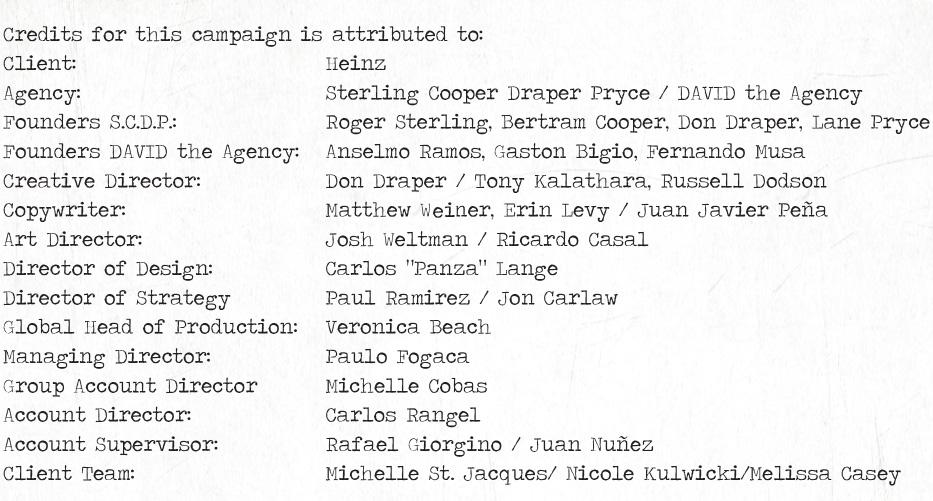 Примечательно, что официальными авторами рекламы названы не только разработавшее нынешнюю кампанию агентство David, но и Дон Дрейпер, создатель его образа сценарист Мэтью Вайнер и вымышленное агентство «Стерлинг-Купер» – все это указано в титрах, которые выполнены машинописным шрифтом в стиле 60-х годов.