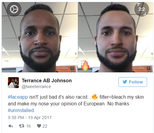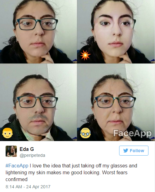 Это дало повод к критике, причем не только в Twitter, но и на страницах FaceApp в App Store и Google Play появилось сразу несколько обвинительных сообщений. Кроме того, нарекания вызвало и исчезновение очков при обработке.