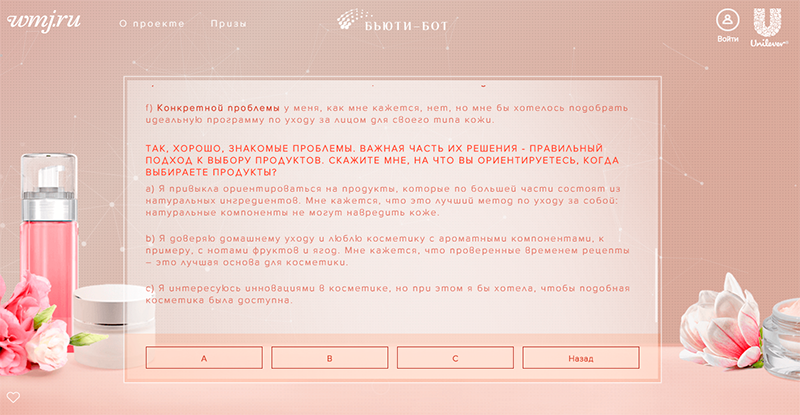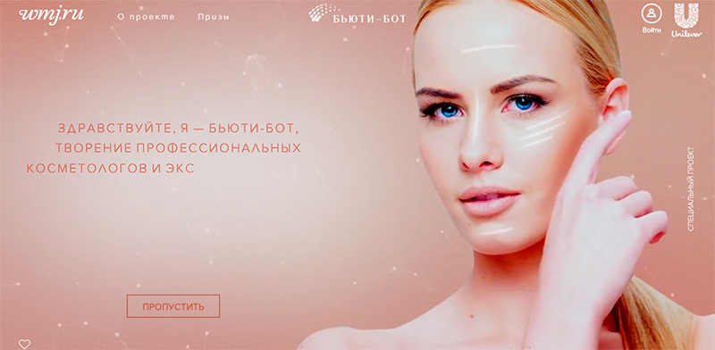 Бот поселился на страницах женского сайта wmj.ru, а общение с ним можно начать, перейдя по ссылке http://beautybot.wmj.ru. Для начала работы с ним нужно ответить на пять вопросов, после чего можно будет получить индивидуальную программу по уходу за лицом. Проект рассчитан на женщин любого возраста, которым будет рассказано об основных косметических средствах и приемах ухода за кожей.