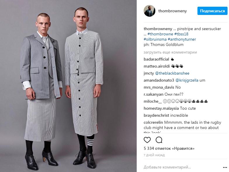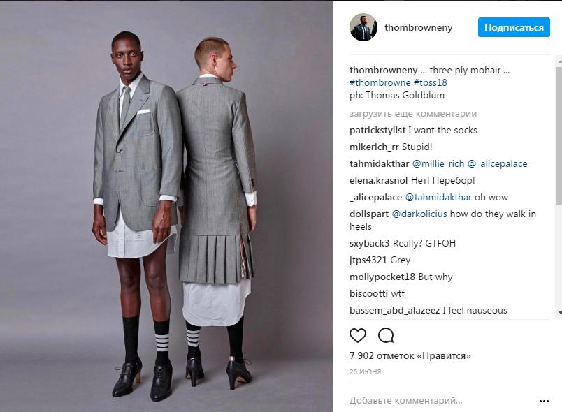 Ни один показа Тома Брауна не остается без внимания, а каждая коллекция становится хитом. Однако в этот раз американский дизайнер по-настоящему шокировал гостей шоу своими фантазиями на тему гендерных различий. Центральное место в новой коллекции для мужчин заняли юбки и каблуки.