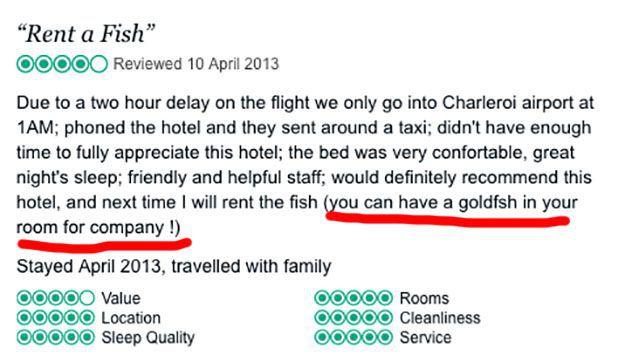 Необычный маркетинговый ход заметила digital producer из Новой Зеландии Мишель Кук, сообщив на своей странице в Twitter, что ее остановившемуся в этом отеле другу предложили такую услугу. После чего сообщение стало набирать вирусную популярность, причем наряду с восхищенными комментариями высказывались и опасения за здоровье рыбы, которую сдают в аренду. Сотрудники отеля успокоили пользователей, сообщив, что за состоянием рыбы ведется тщательное наблюдение, периодически она помещается в помещение с повышенным содержанием кислорода. К тому же, добавили они, если бы она чувствовала себя плохо, ей не удалось бы прожить четыре года - именно такое время отель предоставляет эту услугу. Кстати, стоит рыбье общество 3,5 евро за ночь.