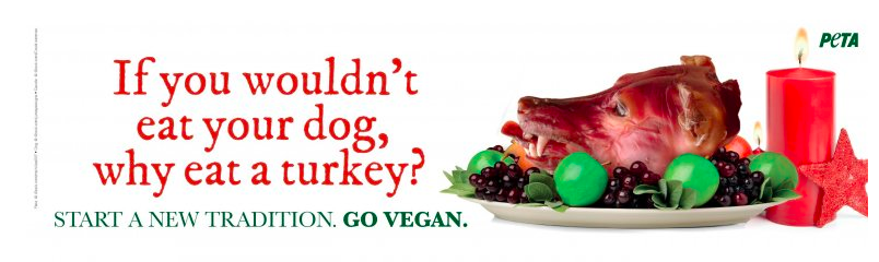 Известная своими скандальными акциями орагнизация по защите прав животных PETA приготовила лондонцам очередной жуткий подарок, сообщает Mashable. В период рождественских праздников по городу должны были разъезжать автобусы с отвратительными плакатами, где вместо знаменитой рождественской индейки красовалась бы запеченная голова собаки. Надпись на баннере была соответствующая: ««Если вы не способны съесть свою собаку, зачем есть индейку? Измените традиции. Станьте веганами».