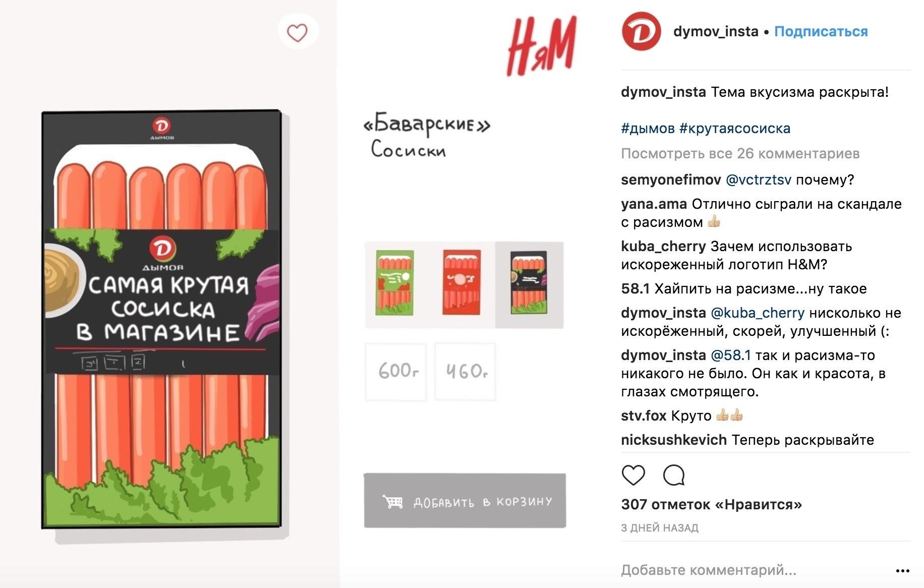 Компания «Дымов» разместила на свой странице в Instagram пост с рекламой сосисок. Надпись на картинке гласит: «Самая крутая сосиска в магазине». Рядом надпись – «НяМ», по стилю написания похожая на логотип известной шведской компании H&M.