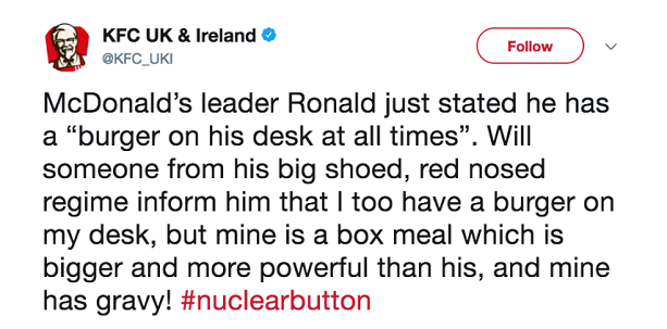 В KFC UK & Ireland оперативно отреагировали на вызвавший резонанс во всем мире твит Дональда Трампа о его ядерной кнопке, которая больше, чем у северокорейского лидера, пишет Businessinsider.