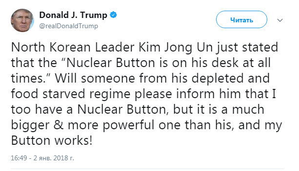Через день после нашумевшего твита американского президента сеть ресторанов опубликовала пародию: «Лидер McDonald’s Рональд только что заявил, что «бургер постоянно находится на его рабочем столе». Может кто-нибудь из его клоунского режима с большими ботинками и красными носами рассказать ему, что у меня тоже есть бургер, но он гораздо больше и мощнее, чем у него, и дополняется меню и соусом! #nuclearbutton»