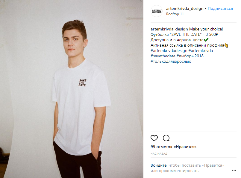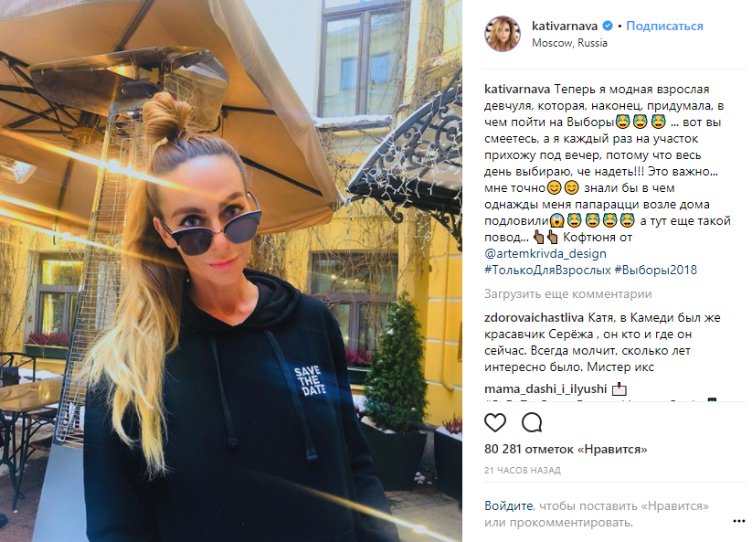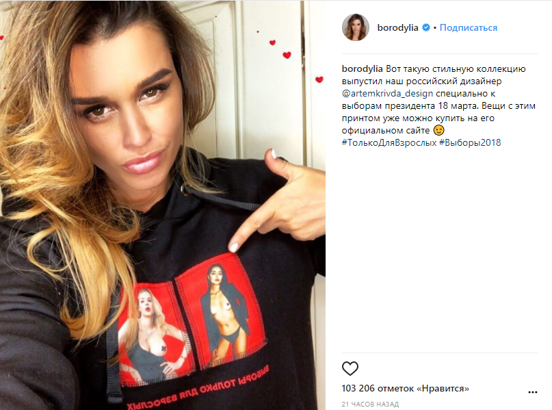 Фотографии футболок и свитшотов с провокационными надписями «SAVE THE DATE» и «Выборы только для взрослых» уже появились в Instagram таких звезд, как Катя Варнава и Ксения Бородина.