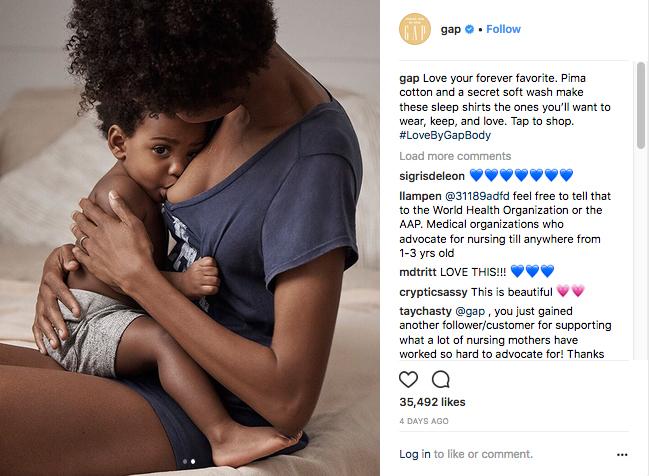 Реклама бренда одежды Gap набрала в соцсети Instagram десятки тысяч лайков и перепостов, пишет Creativity. Производитель продвигает новую коллекцию одежды класса люкс Love By GapBody и разместил фотографию свободного платья-футболки, позволяющего благодаря удобному вырезу кормить грудью ребенка.