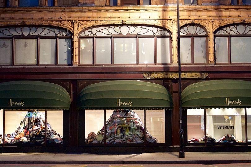 Витрины дорогого лондонского универмага Harrods с сегодняшнего дня украшены необычным образом — там свалены кучи ношеной одежды, рассказывает Vogue. Так модный бренд Vetements проводит кампанию против перепроизводства в мире моды.