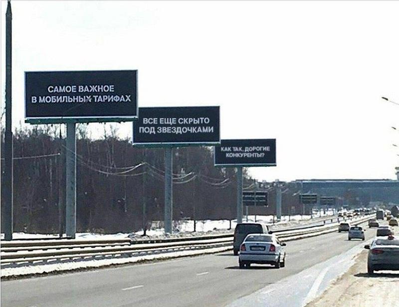 В начале марта, как подтвердили в пресс-службе Tele2, недалеко от аэропорта Домодедово появились три билборда оператора. Использовав стилистику фильма «Три билборда на границе Эббинга, Миссури», компания напомнила, что часто самая важная для клиентов информация в мобильных тарифах обозначена звездочкой и трудночитаема, и задала вопрос конкурентам, до каких пор это будет продолжаться.