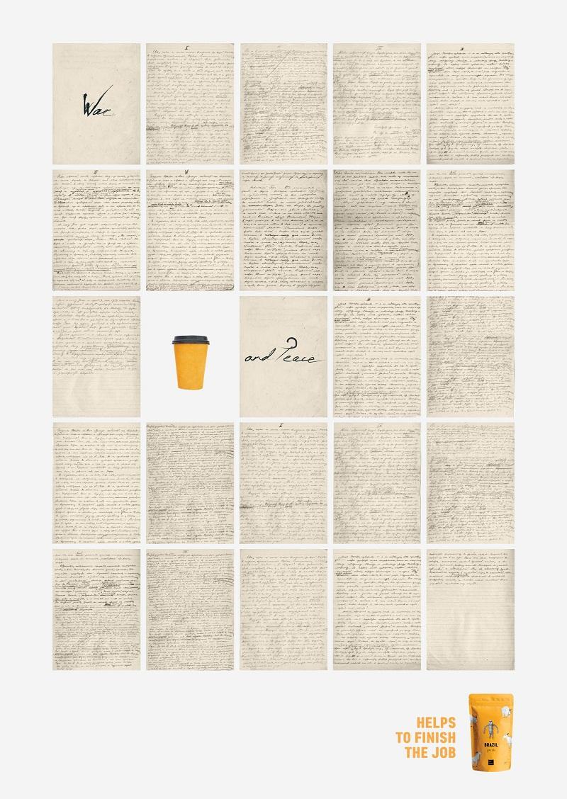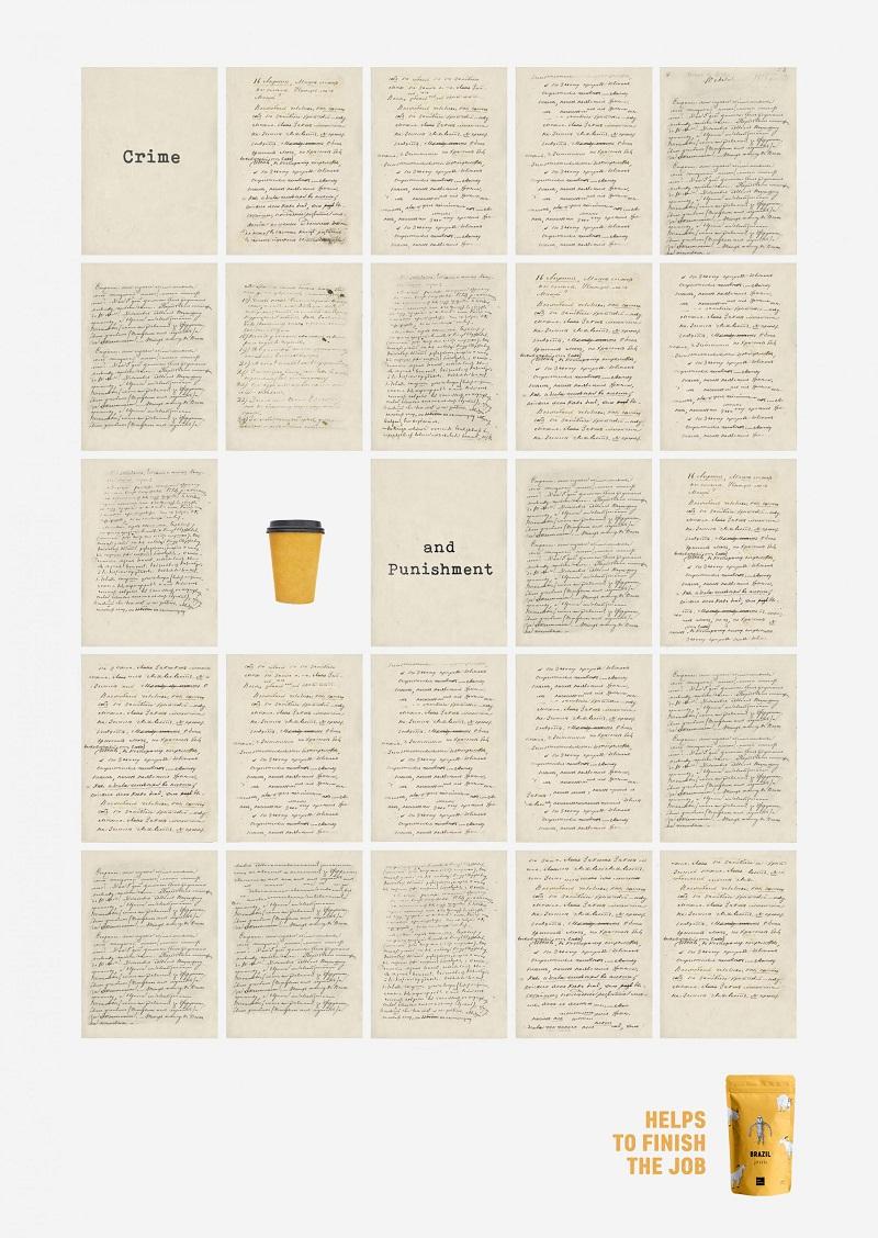 Два принта с использованием рукописей русских классиков разработало киевское R Agency для кофейного бренда Lazy Coffee, рассказывает Adsoftheworld. Большие плакаты оформлены страницами из рукописей «Войны и мира» и «Преступления и наказания».