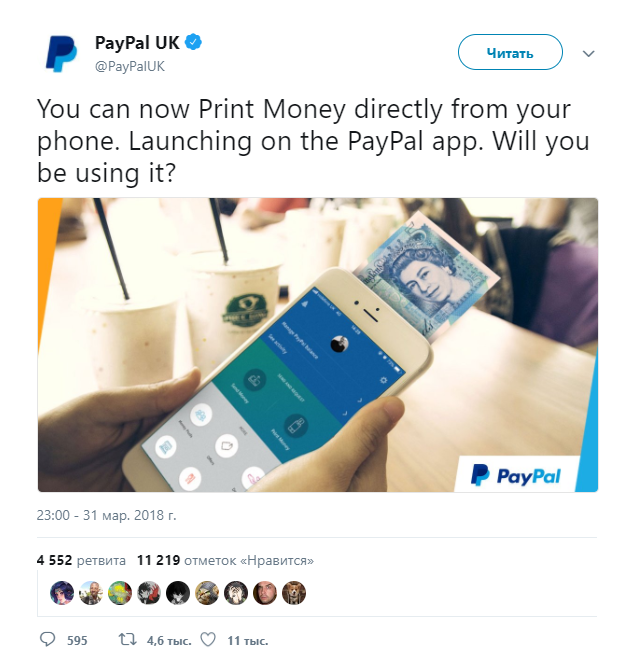 В Великобритании система PayPal анонсировала приложение для телефона, с помощью которого пользователи самостоятельно смогут печатать деньги.