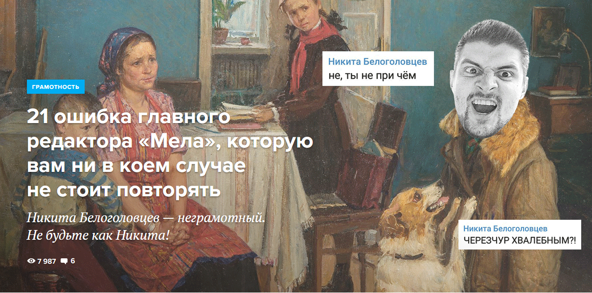 Редакция образовательного ресурса «Мел» «пошутила» над главным редактором издания Никитой Белоголовцевым и опубликовала материал: «21 ошибка главного редактора 'Мела', которую вам ни в коем случае не стоит повторять.» «Жестокая шутка!» — воскликнула наш главный редактор. «Только это не шутка» — заметили мы.