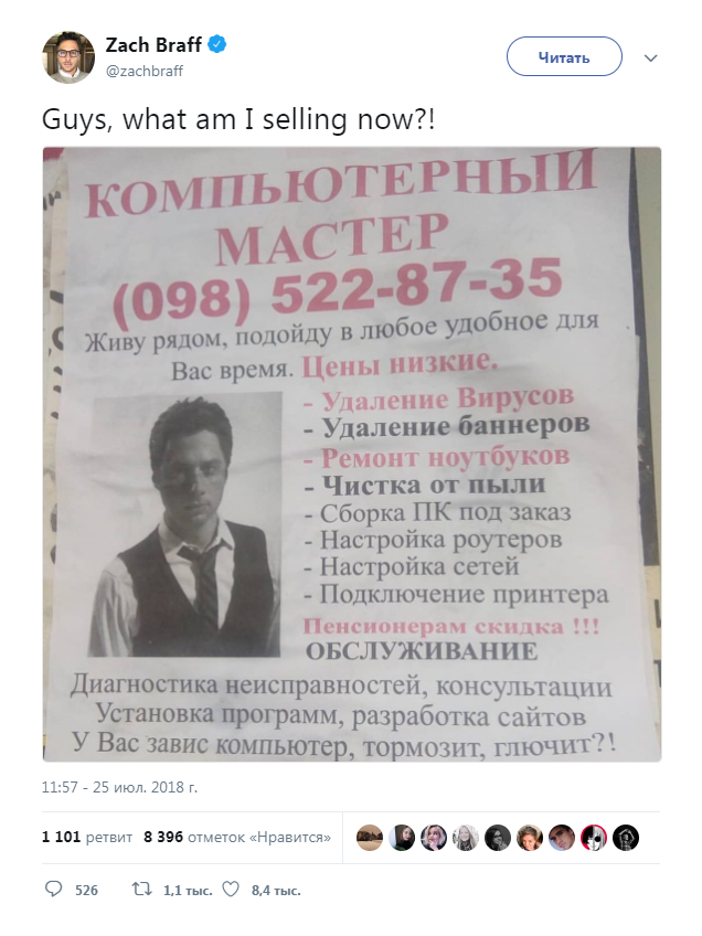 В листовках с рекламой «компьютерного мастера», где размещено фото Браффа, предлагаются такие услуги, как удаление вирусов и баннеров, ремонт ноутбуков, чистка от пыли, сборка персональных компьютеров под заказ, настройка роутеров, настройка сетей и подключение принтеров, все по низким ценам. Реклама также обещает скидки пенсионерам, а также различные виды обслуживания, диагностику, консультацию, установку программ и разработку сайтов.