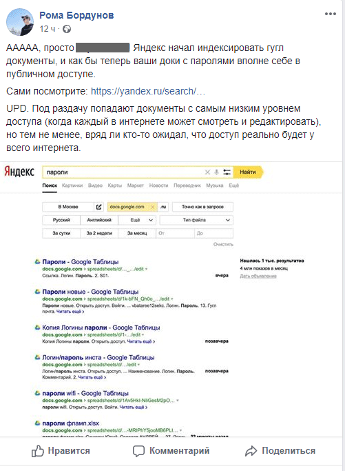 Вчера пользователи рунета обратили внимание, что через поиск «Яндекса» можно получить доступ к приватным документам, которые хранятся в сервисе Google Docs. Если ввести точный поисковый запрос, то можно найти пароли, отчеты и таблицы, которые не были защищены настройками приватности. Руководитель департамента системных решений компании Group IB Антон Фишман отметил ТАСС, что отображение содержания документов не является утечкой конфиденциальных данных, а происходит при использовании определенных настроек конфиденциальности. Отображаются только файлы, к которым сами пользователи установили опцию «общедоступно для поиска и просмотра», рассказал он изданию.