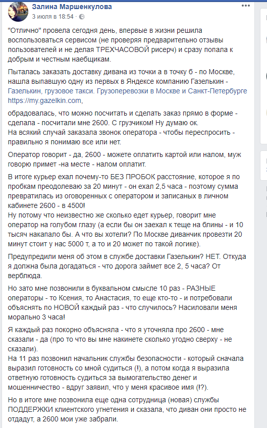 Ранее г-жа Маршенкулова написала на своей странице, что заказала в «Газелькине» доставку дивана по фиксированной стоимости услуги. Однако, когда машина приехала, с нее взяли указанные на сайте 2600 руб. и потребовали сверху 1900 руб. за 2,5 часа, потраченные сотрудниками компании в дороге. О возможном повышении цены Залину Маршенкулову не предупредили. Клиентка отказалась доплачивать за заказ, и тогда грузоперевозчик заявил, что не отдаст ей диван.
