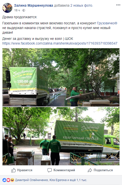 Компания «Грузовичкоф» купила диван основательнице Breaking Mad Залине Маршенкуловой после того, как другой грузоперевозчик «Газелькин» отказался отдавать клиентке ее мебель. Об этом она сообщила в своем Facebook.
