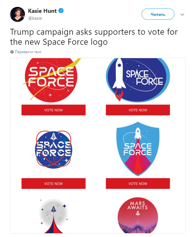 В социальных сетях высмеяли варианты логотипа для будущих Военно-космических войск США, передают «Известия». Эмблемы были представлены командой президента США Дональда Трампа, все желающие могли выбрать понравившийся им вариант.