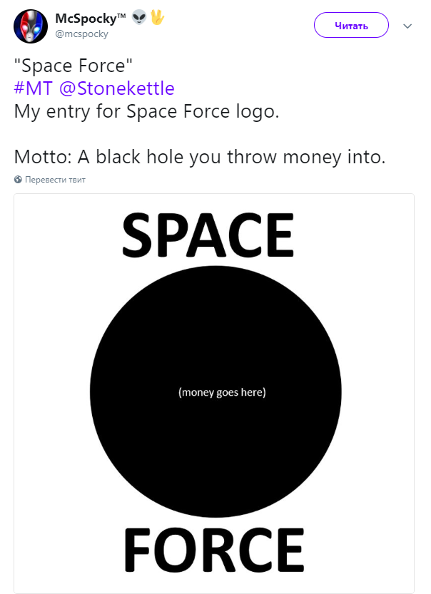 Российское посольство в США не упустило возможности посмеяться над созданием Военно-космических войск и выложило в Twitter логотип Космических Войск России с подписью «Доброе утро, Космические силы» и ссылкой на сайт Министерства Обороны России.