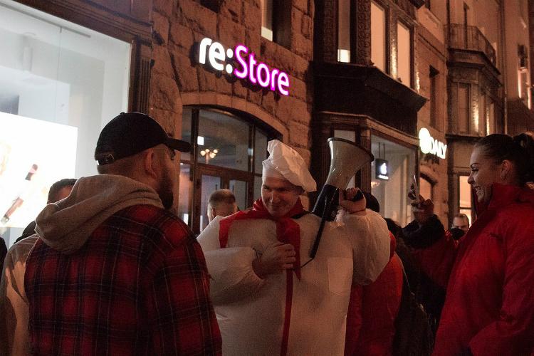 Организаторы рассказывают, что пытались развлечь ожидающих новых iPhone людей с помощью аниматоров и надувного повара, но еда была превыше всего.