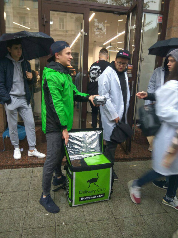 Подобную гуманитарную акцию провели и коллеги Pizza Hut по цеху из Delivery Club. К открытию магазина Delivery совместно с бургерной Farш привезли ожидающим фанатам Apple свежих бургеров. По сообщению представителей Delivery Club, еда закончилась очень быстро.