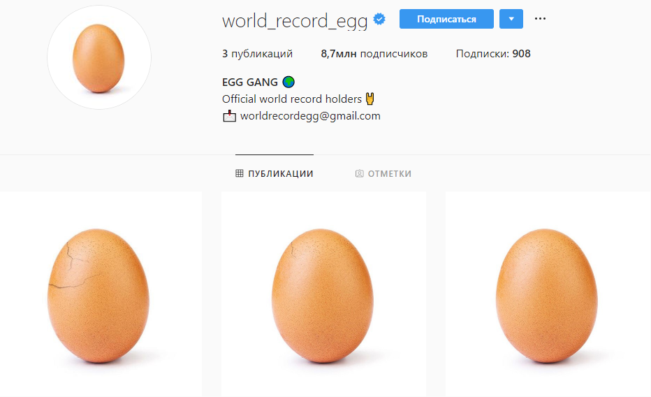 Фотография куриного яйца из Instagram-аккаунта world_record_egg была опубликована 4 января 2019 г. Кто стоит за этим аккаунтом, до последнего времени не было понятно. Под фото содержался лишь призыв ставить «лайки»: «Давайте залайкаем этот пост и установим мировой рекорд в Instagram». Идея показалась забавной пользователям, и многие поддержали акцию. За несколько дней запись собрала более 50 млн лайков и стала самой популярной в истории Instagram. Позже в аккаунте появилась ссылка на интернет-магазин Everpress, торгующий футболками с надписями «Я лайкнул яйцо».