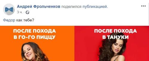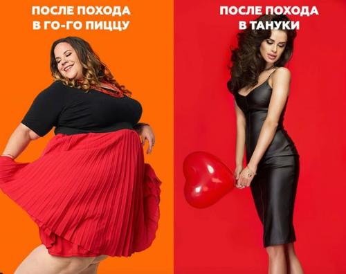 Утром бренд выложил в социальных сетях пост, в котором изображались две девушки: стройная любительница суши и располневшая посетительница «Гого Пиццы». Подпись к публикации гласила: «Твоя девушка сегодня вечером». Пост возмутил подписчиков компании, они назвали рекламу неэтичной и потребовали уволить SMM-менеджера.