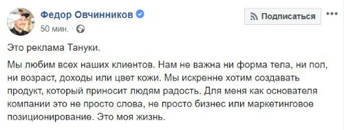 Руководителем SMM «Тануки» недавно стал Андрей Фрольченков; он также выложил публикацию в своем Facebook, где отметил основателя сети пиццерий «Додо Пицца» Федора Овчинникова.