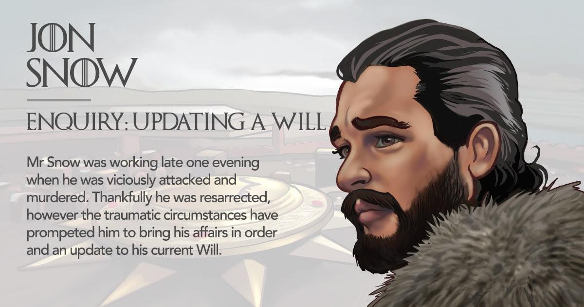 Адвокатская компания First4Lawyers выпустила рекламу с Джоном Сноу из «Игры Престолов». Как сообщает Campaign, после громкого воскрешения главный персонаж сериала обратился к адвокатам за помощью, чтобы составить завещание, если он второй раз столкнется со смертью.