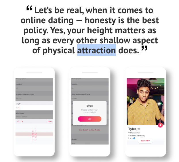 Приложение знакомств Tinder запустило новую функцию — «значок проверки высоты». Объясняя это тем, что рост является важным фактором при выборе партнера.