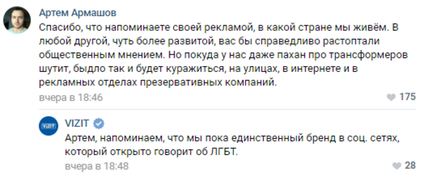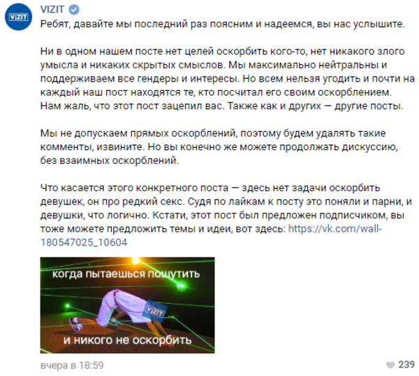 В диалоге с возмущенными пользователями представители бренда подчеркнули, что указывают в своих публикациях на людей конкретного пола, если в подписи есть соответствующая игра слов. Так, в провокационных постах Vizit можно встретить такие обороты, как «большой теннис» и «мандат».