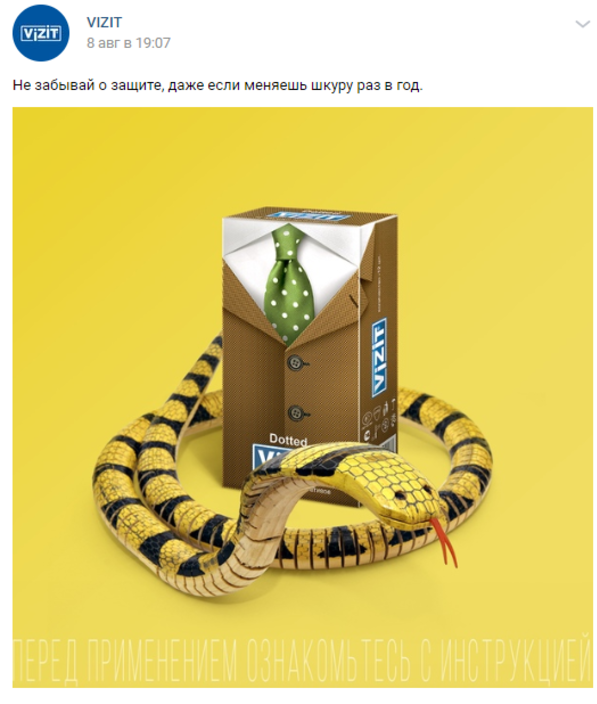 Новый пост бренда презервативов Vizit в соцсетях вызвал негативную реакцию пользователей. В публикации бренд призвал помнить о контрацепции «даже при смене шкуры раз в год», разместив изображение со змеей.