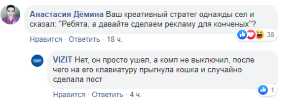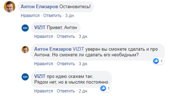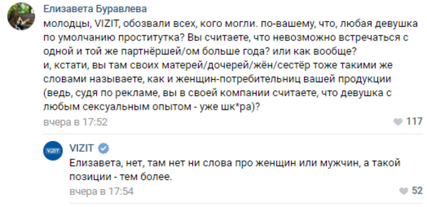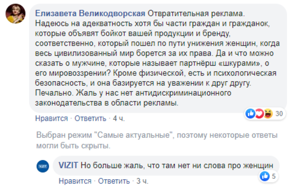 Хотя Vizit регулярно публикует посты с двусмысленным подтекстом, резко отрицательный отклик бренд получил впервые за долгое время. Многие пользователи посчитали публикацию оскорбительной для женщин, а некоторые увидели в ней отражение социальных проблем в стране. Представители бренда вступили в диалог практически со всеми пользователями, попытавшись переубедить их или отшутиться.