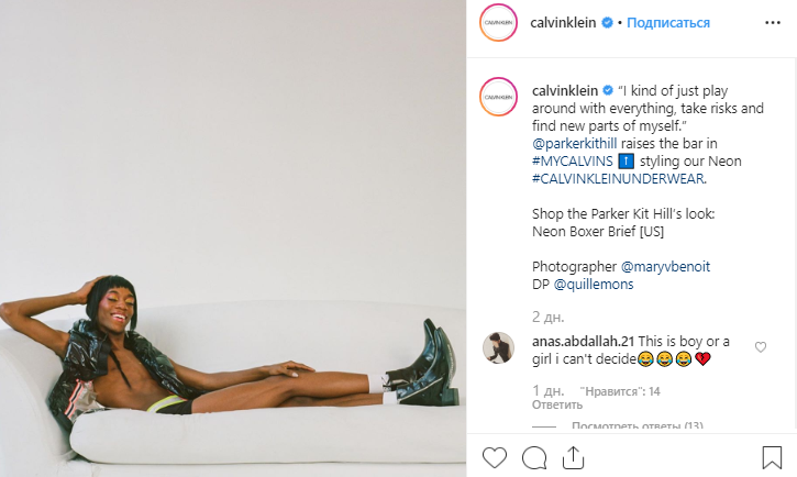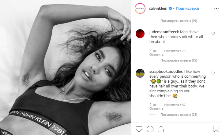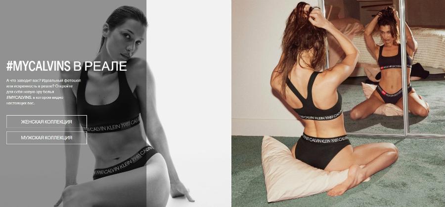 Компания призвала к искренности и отказу от фотошопа. «А что заводит вас? Идеальный фотошоп или искренность в реале? Откройте для себя новую эру белья #MYCALVINS, в котором видно настоящих вас», — поясняется на сайте бренда.
