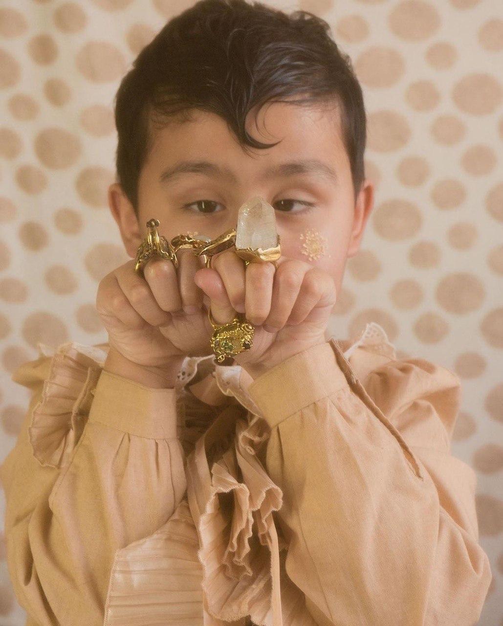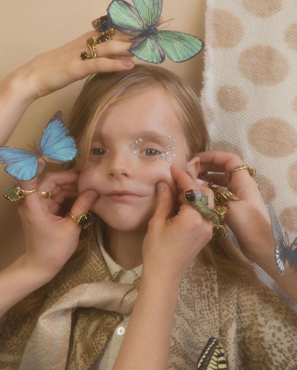 Фотографии весенней коллекции бренда появились в сети 6 марта. В съемках участвовали только дети, судя по снимкам, мальчик и три девочки. Они демонстрировали кольца, браслеты и подвески из серебра и бронзы. Все украшения были выполнены в традиционном стиле бренда — грубые формы металлов и необработанные минералы. Для фотосессии на площадку привезли животных: на снимках одна девочка держит в руках небольшую собаку, а другая играет с бабочками.