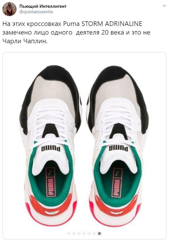 Кроссовки спортивного бренда Puma стали объектом обсуждения и шуток среди пользователей сети. В дизайне модели Adrenaline Storm пользователи разглядели портрет вождя Третьего рейха Адольфа Гитлера: черные вставки напомнили людям знаменитую прическу и усы нацистского лидера.