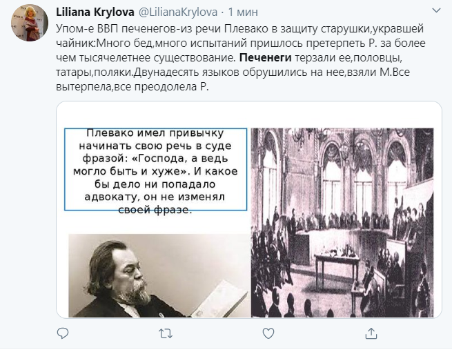 Пользователей соцсетей попытка приободрения позабавила. Некоторые обратили внимание на то, что аналогичная фраза уже была произнесена — дореволюционным российским адвокатом Федором Плевако.