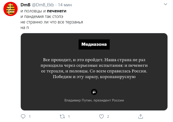 Свое обращение к губернаторам президент закончил словами «и печенеги терзали Россию, и половцы, а вместе с вами мы уж короновирус победим».