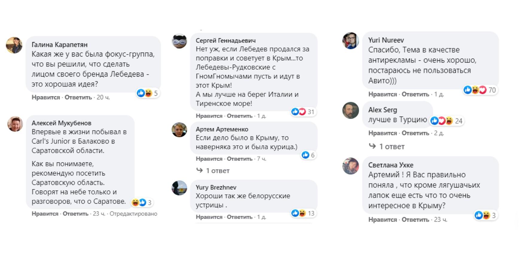 Сайт Avito запустил кампанию с дизайнером Артемием Лебедевым, в которой позвал в путешествие по России. Реклама размещается в Facebook и Instagram. В кампании Лебедев призывает посетить Ялту, где он впервые попробовал лягушачьи лапки, Керчь, чей флаг можно спутать с американским, Москву, Санкт-Петербург, Таганрог, Великий Новгород и Краснодар.