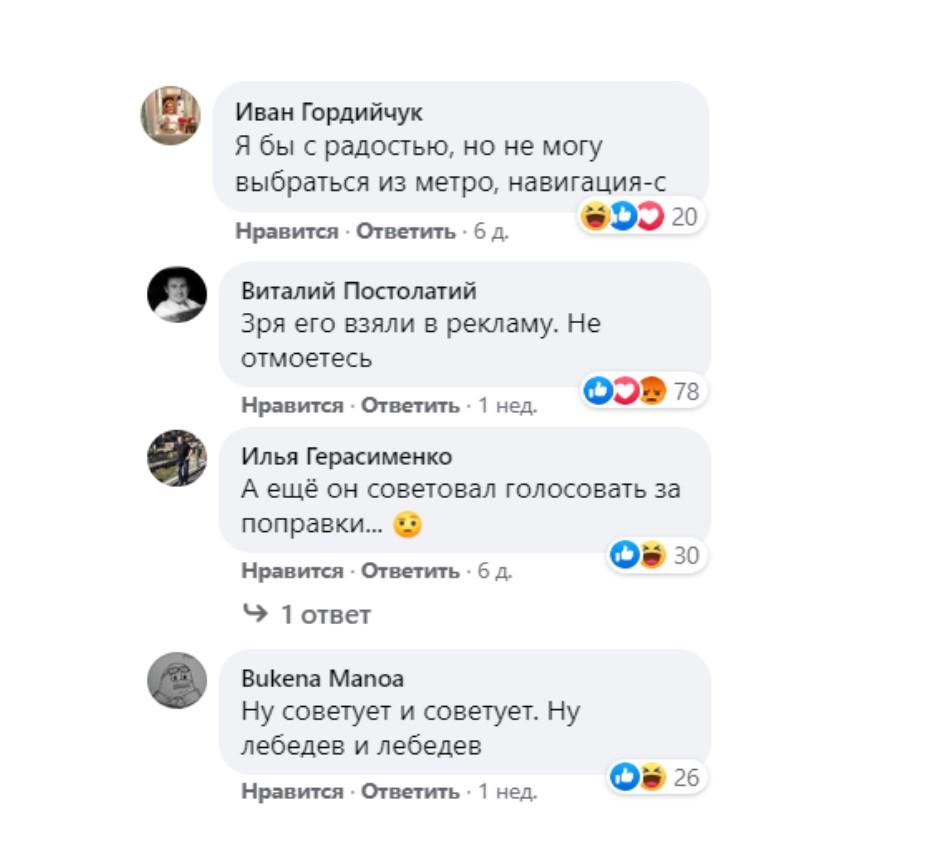 Многие пользователи Facebook критически отнеслись к выбору бренда и припомнили Лебедеву съемки в рекламе поправок в конституцию. После появления ролика на YouTube-канале RT дизайнер заявил, что его «слегонца *****» [обманули. — Прим. ред.]. По его словам, на момент съемок он был уверен, что предложение об обнулении сроков президента Владимира Путина не имеет никакого отношения к тексту конституции.